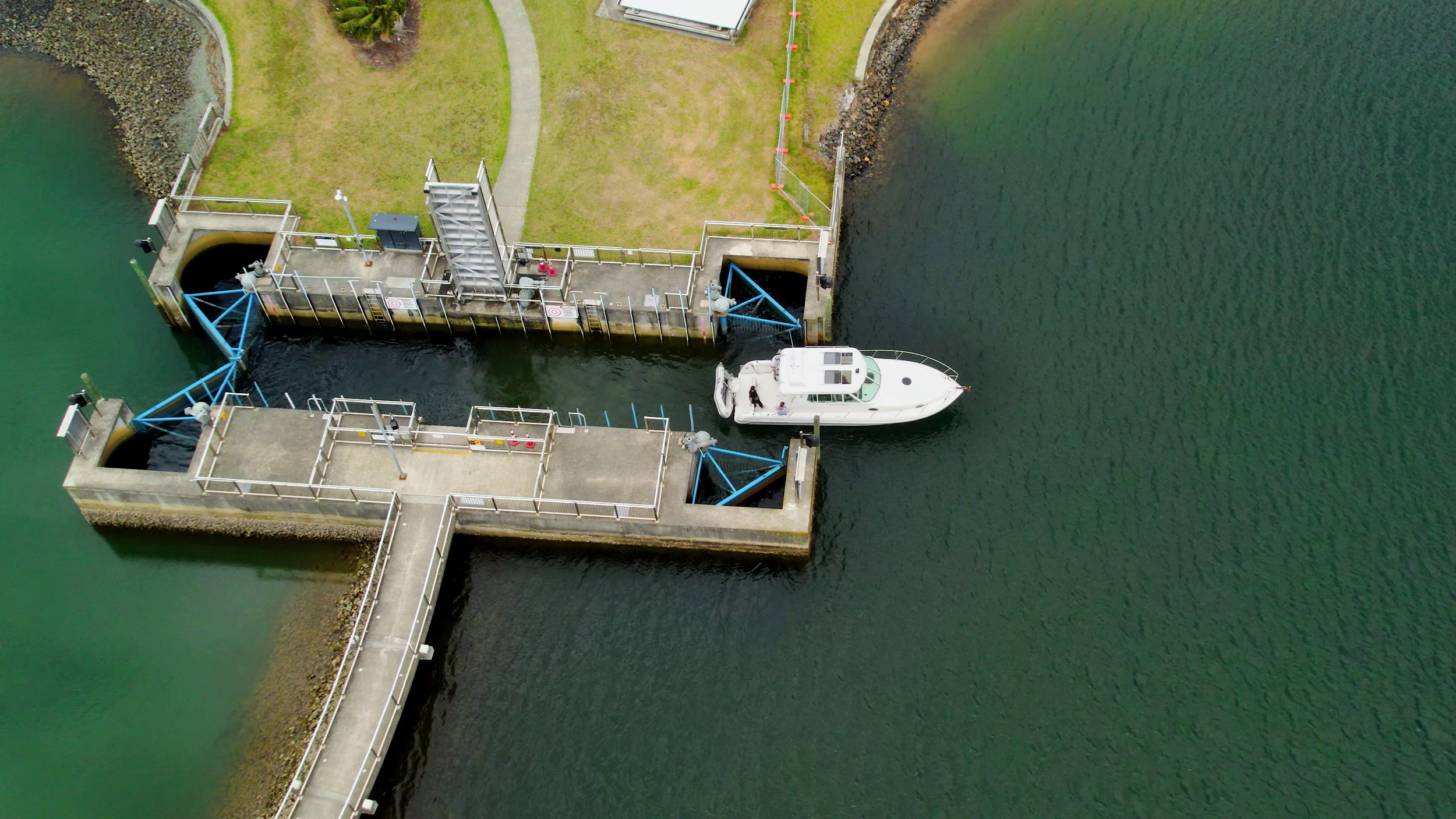 The Lock mechanism is a technically sophisticated combination of concrete, stainless steel, gearboxes, sensors and computer equipment capable of comfortably transferring vessels of 20m in length, 6m beam and 3m draft. The Lock is attached to an adjoining 20m weir, with a level set 0.7m below mean high sea level. This enables an exchange of clean water with each tide cycle to maintain excellent quality seawater within the locked stages. Fenders, signals and safety mechanisms enable a hands-free operation. Two or three trailer craft can easily pass through in one cycle. The cycle time varies from high tide to low tide at 4 to 10 minutes. It also enables pedestrians to cross via a vertical bridge, where we ask property owners to give pedestrians right of way when accessing the Lock.